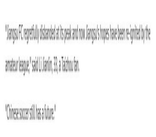 路透社采访了一位来自泰州的球迷,他曾犹豫是否让儿子走足球道路,但14岁的儿子在7月观看泰州队战胜镇江队后坚定了踢球的决心。