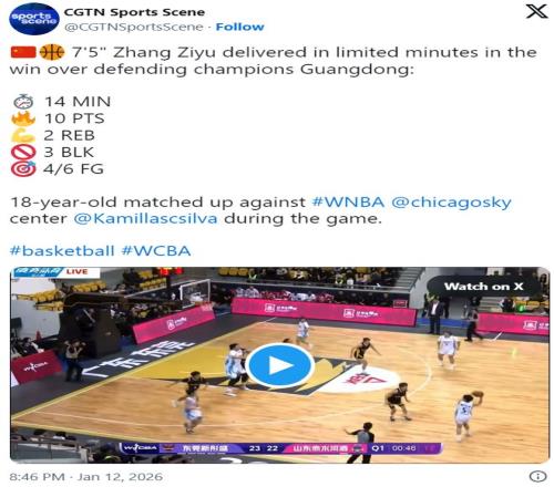 年仅18岁、身高达到7英尺3英寸(约2米21)的中国女篮新星张子宇,近日在职业赛场上的表现引爆社交媒体——因为她在WCBA赛场上,正面“碾压”多位WNBA成名球员。